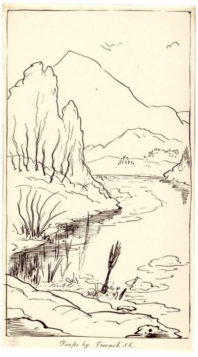 весенний пейзаж в стиле романтической черно-белой гравюры XIX века. Вертикальная композиция с тремя ярусами глубины:, Передний план: немного воды с частой рябью от сильного ветра. Крупным планом — одна стрела, воткнутая в грязь у самой воды., Средний план (контраст): Круто вздымающийся обрывистый берег, поросший лесом. Кроны деревьев резко согнуты одним мощным порывом ветра., Задний план (масштаб): Величественные горные хребты с чёткими вершинами под высоким чистым небом., ощущение весны, надежды, порывистого ветра как обновления, динамичное изображение