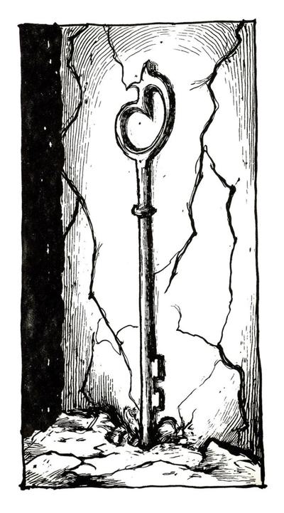 книжная иллюстрация, высокая детализация, черно-белая, стиль Альбрехта Дюрера, викторианская готика, высокая контрастность, старая оштукатуренная стена в полумраке, мощный стальной ключ вбит в штукатурку до половины своей длины, от ключа по стене во все стороны расходятся глубокие трещины в штукатурке, словно от сильного удара, некоторые трещины тянутся до края изображения, штукатурка местами осыпалась, обнажив кирпичную кладку под ней, свет падает сверху слева, подчеркивая рельеф трещин и блеск стали ключа, атмосфера необратимости, разрушения и бесповоротного решения, минимализм, символизм