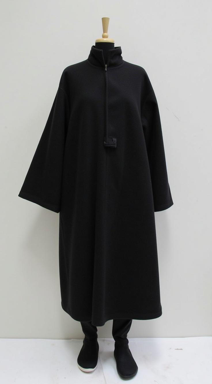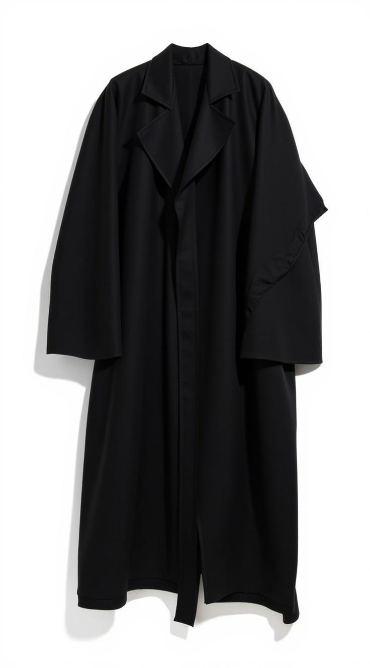 Черное пальто в японском стиле дизайнера йоджи ямомомто с элементами ассиметрии и деконструкции