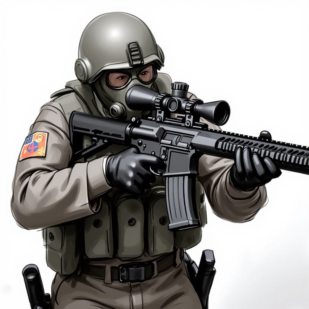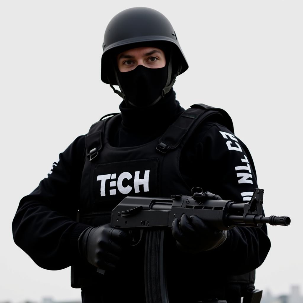 Городской оперативник спецназа , весь в чёрном , лицо в Балаклаве , глаза открыты , на голове военная каска тоже чёрного цвета, он держит в руках автомат АК 12 в чёрном цвете, на бронежилете написано белыми буквами TECH. Такие же надписи на рукавах у плеча. Руки в чёрных перчатках. Оперативник находится в положении прицеливания. Ноги немного согнуты в коленях, правым глазом целится. В полный рост. 8k