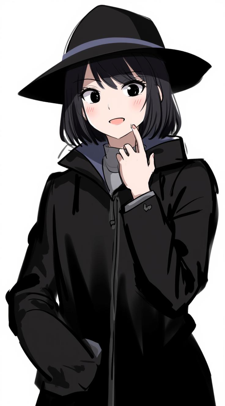 Девушка с черными волосами и черными глазами. Носит черный плащ и черную шапку на голове.