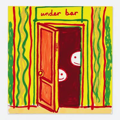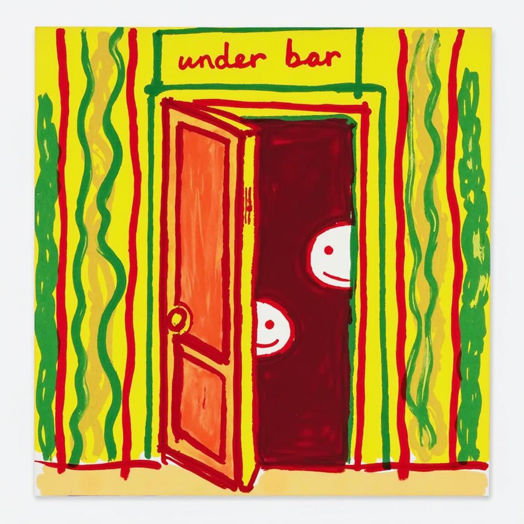 Дверь с надписью «Андер бар», всё разрисовано яркими волнистыми линиями, из приоткрытой двери смотрит улыбающееся лицо