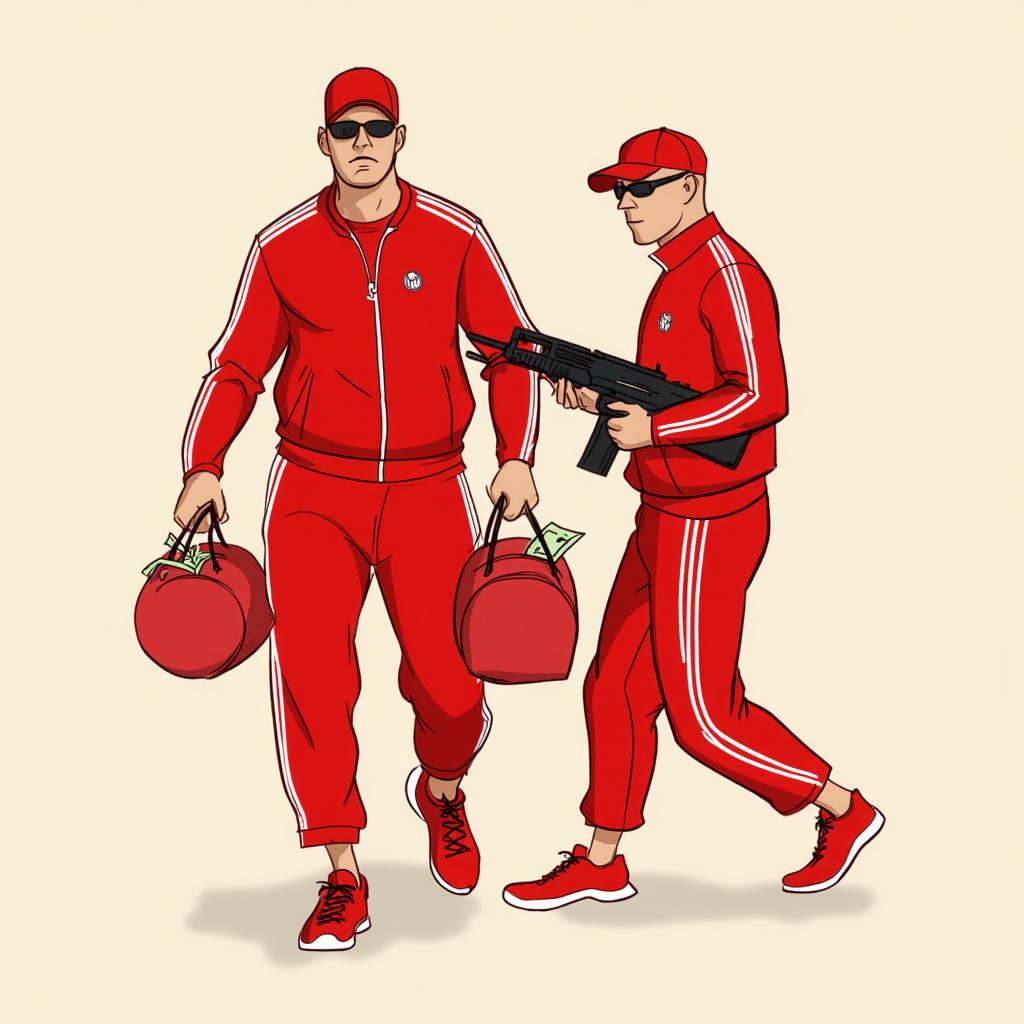 Два грабителя в красной спортивной форме с белыми полосками , у одного в руках две спортивные сумки, из одной сумки торчат доллары, второй грабитель идёт сзади, спиной к первому и держит автомат, оба обуты в красные кеды с белой подошвой, на них чёрные очки и красные кепки, 8k