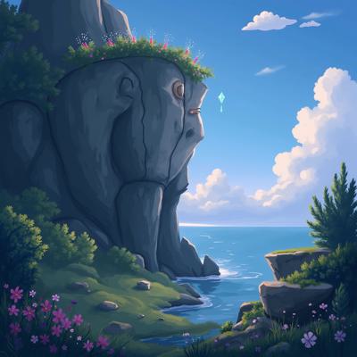 Волшебный пейзаж для детской сказки. Гигантский утес, похожий на древнего великана, в расщелине которого растут светящиеся цветы. По его каменной щеке скатывается одна бриллиантовая капля росы. В небе далеко-далеко улетает сияющая тучка-путешественница. Стиль волшебного реализма, мягкое освещение, глубокие цвета.
