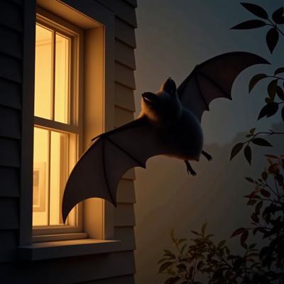 Покадрово полет летучей мыши которая вылетает из окна дома