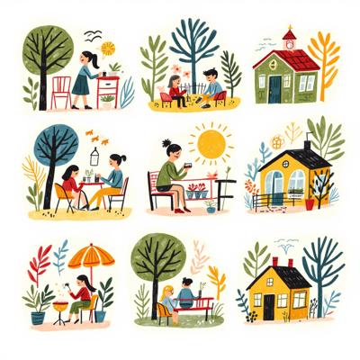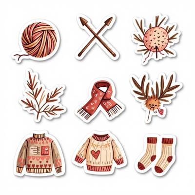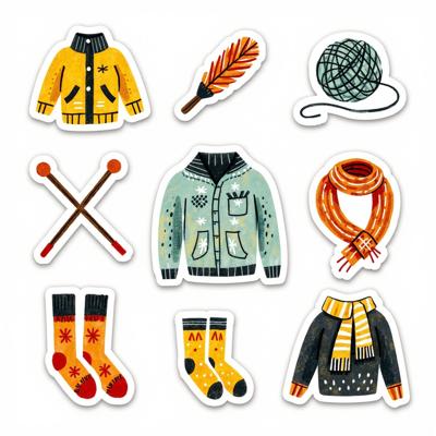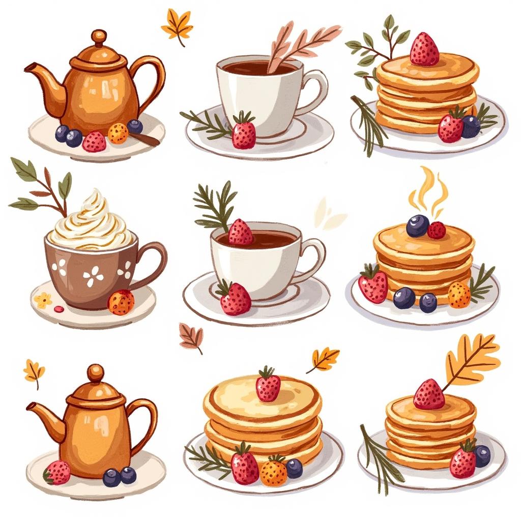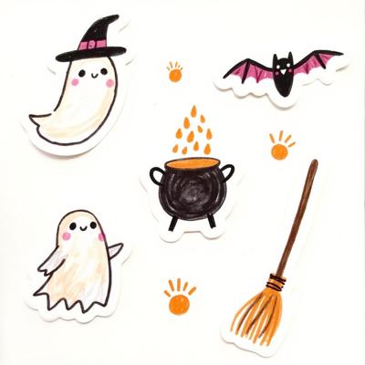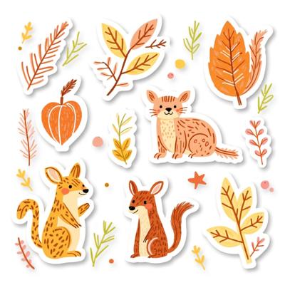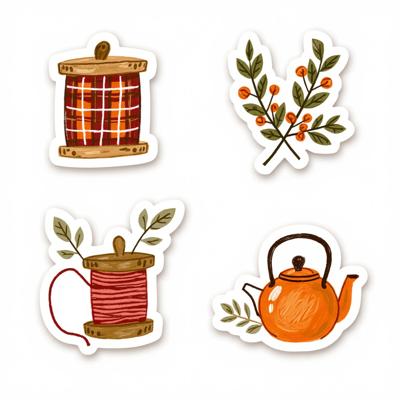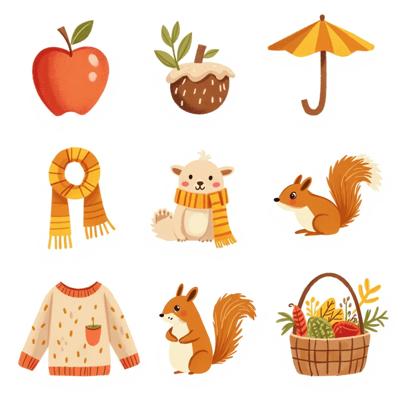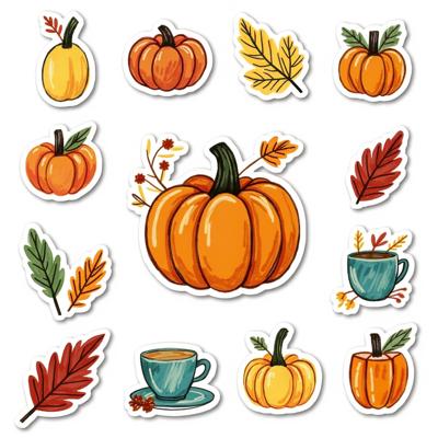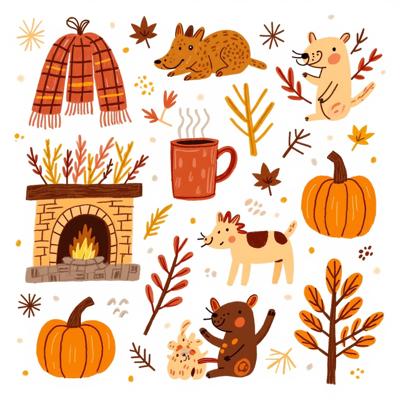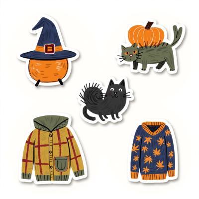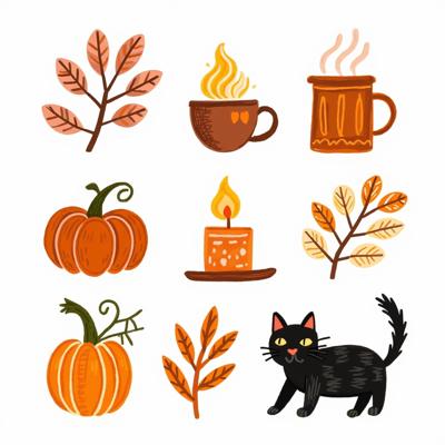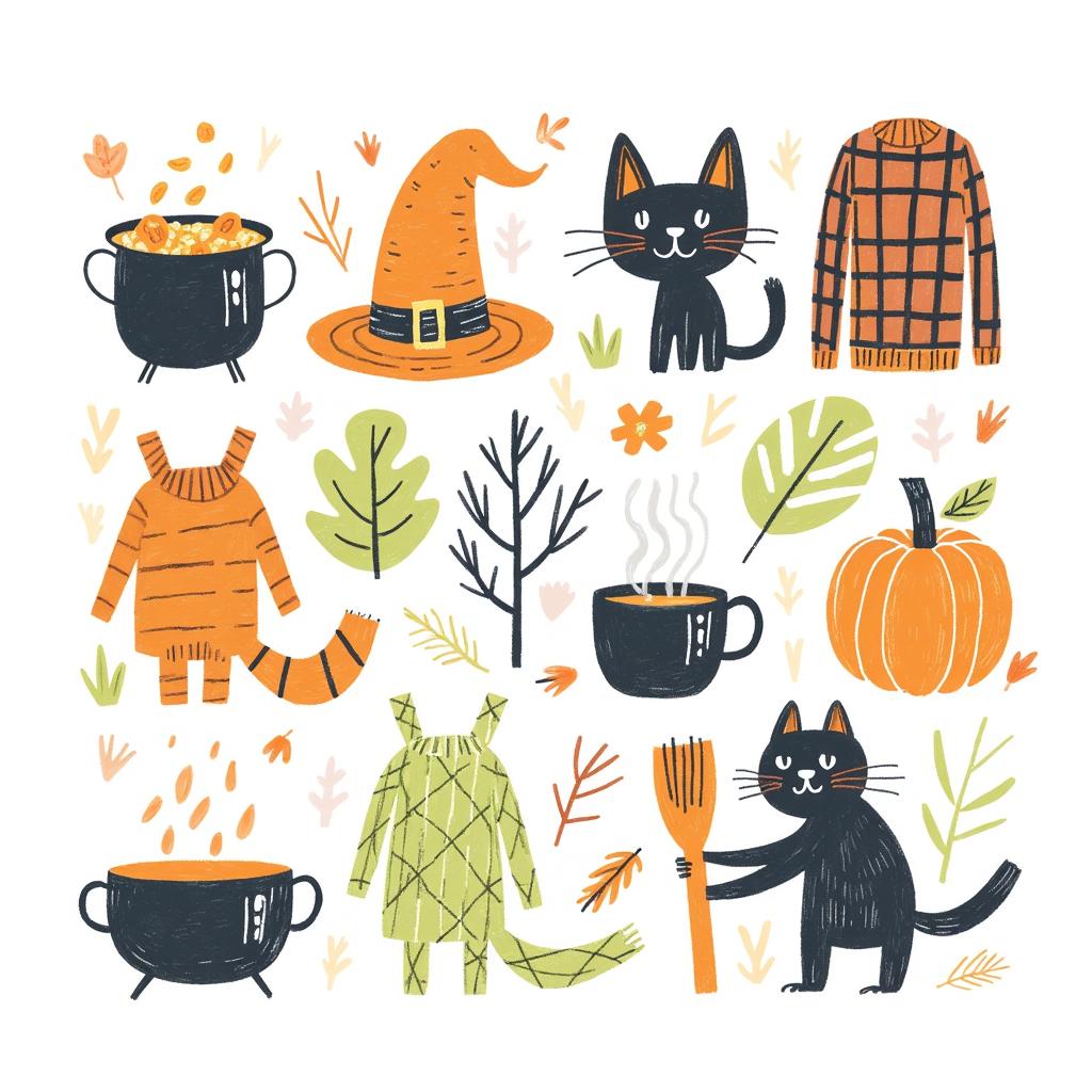 Нарисуй набор стикерпака в стиле hand-drawn иллюстрация. Каждый стикер должен быть на белом фоне. Простые формы, минимум деталей, милая, уютная рисовка, как в детских книжках. Тема: осень. Цвета: оранжевый, зелёный, темно-синий. Вот примеры объектов для стикеров: ведьмин котел, чёрный котик, плед, свитер