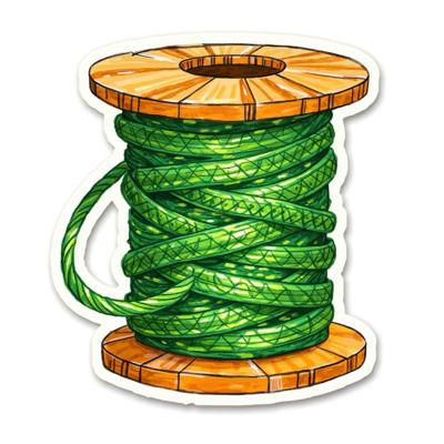 Стикер катушка зеленых ниток. Катушка имеет цилиндрическую форму с деревянными боковинами оранжевого цвета. На катушке аккуратно намотаны зеленые нитки, которые создают текстурный эффект благодаря пересекающимся линиям. Нитки выглядят объемными и детализированными, что придает рисунку реалистичность. Фон рисунка полностью белый
