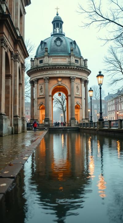 "Создайте реалистичное изображение архитектурного здания с куполообразной крышей, отражающегося в водной поверхности в спокойной, немного туманной атмосфере. Используйте стиль классической архитектуры с деталями колонн и фонарей, подчеркните тёплое освещение и мягкие тени. Основной мотив — зеркальное отражение здания в воде, создающее ощущение гармонии и спокойствия." Черно белое фото