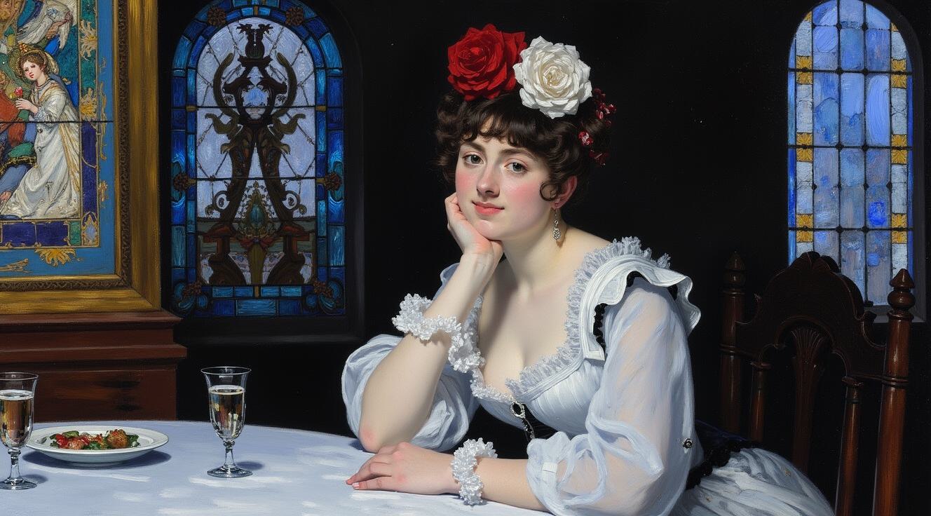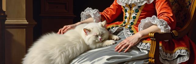 Привет создай обложку для книги. Названия и имя автора не надо. Просто картинка. book cover, historical fiction, 1560s, a woman's hand in an elaborate wedding gown with hybrid french-spanish embroidery resting on a chair, a large fluffy pure white cat sleeping on the same chair, dimly lit room with dark blue background, chiaroscuro lighting, elegant and melancholic mood, muted colors with accents of white and gold, intricate details, professional photography, dramatic, 8k