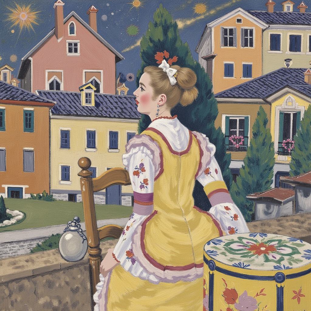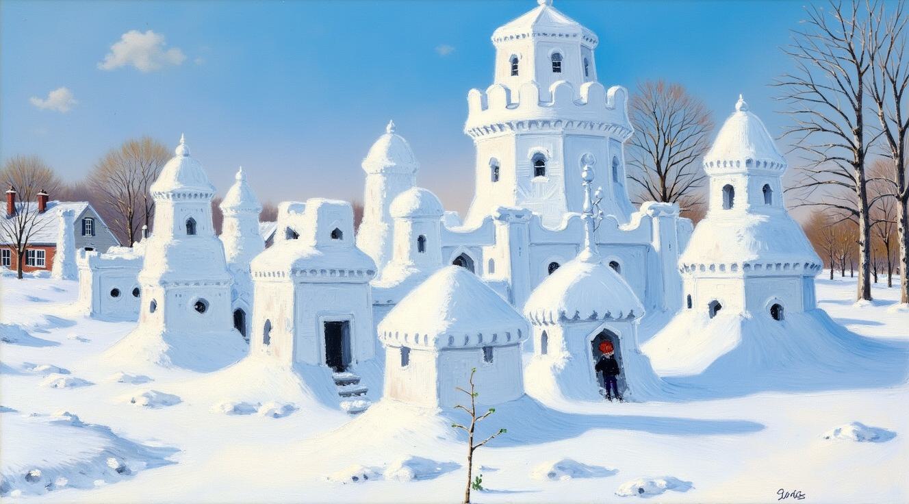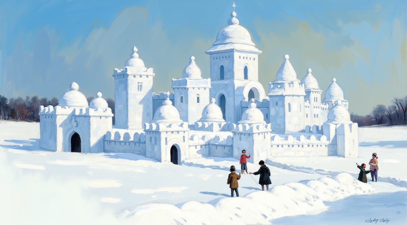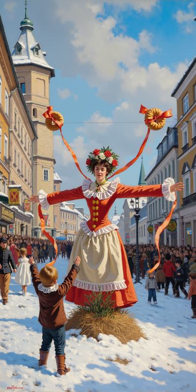 children and adults celebrating against the backdrop of an urban landscape with historical buildings and a snowy landscape. The main object is a spring scarecrow-woman with bright ribbons and a colorful outfit, symbolizing the end of winter. Children hold bagels and ribbons, joyfully participating in the celebration. Clear lines and bright colors. The bright sky has a festive atmosphere, and the shadows are soft. The dynamic poses of the characters reflect joy and fun. в стиле художника Николая Хапилова