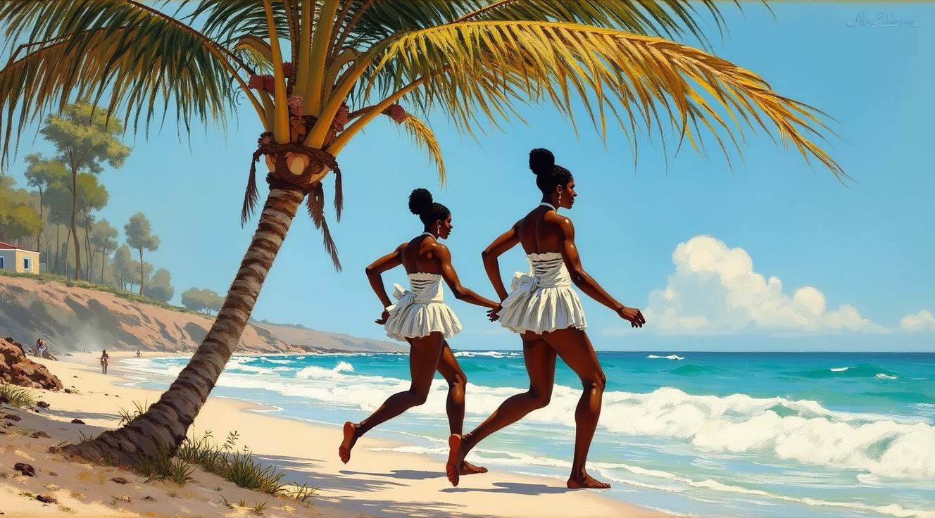 НАРИСУЙ КАРТИНУ В СТИЛЕ Jack Vettriano .Сложные вытянутые геометрические формы, модерн, фигуры в стиле КАРТИН Jeremy Mann В СОЛНЕЧНЫЙ ДЕНЬ, НА БЕРЕГУ ПАЛЬМЫ ТРИ АФРИКАНСКИЕ ЖЕНЩИНЫ В ПРОФИЛЬ В НАБЕДРЕННЫХ КОРОТКИХ МИНИ ПОВЯЗКАХ С НИМИ Басенджи . ДВЕ ЖЕНЩИНЫ БЕГУТ РЯДОМ, ОДНА ЧУТЬ ПОЗАДИ СТРЕМИТЕЛЬНО БЕГУТ ВДОЛЬ АТЛАНТЧЕСКОГО ОКЕАНА