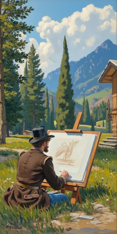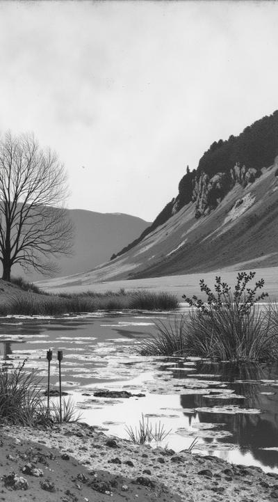 весенний пейзаж в стиле романтической черно-белой гравюры XIX века. Вертикальная композиция с тремя ярусами глубины:, Передний план: немного воды с частой рябью от сильного ветра. Крупным планом — одна стрела, воткнутая в грязь у самой воды., Средний план (контраст): Круто вздымающийся обрывистый берег, поросший лесом. Кроны деревьев резко согнуты одним мощным порывом ветра., Задний план (масштаб): Величественные горные хребты с чёткими вершинами под высоким чистым небом., ощущение весны, надежды, порывистого ветра как обновления, динамичное изображение