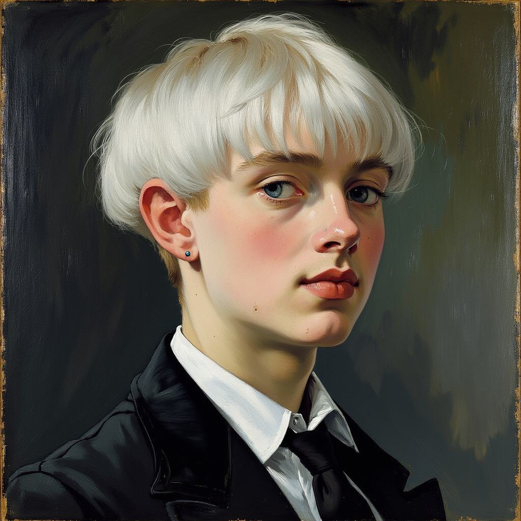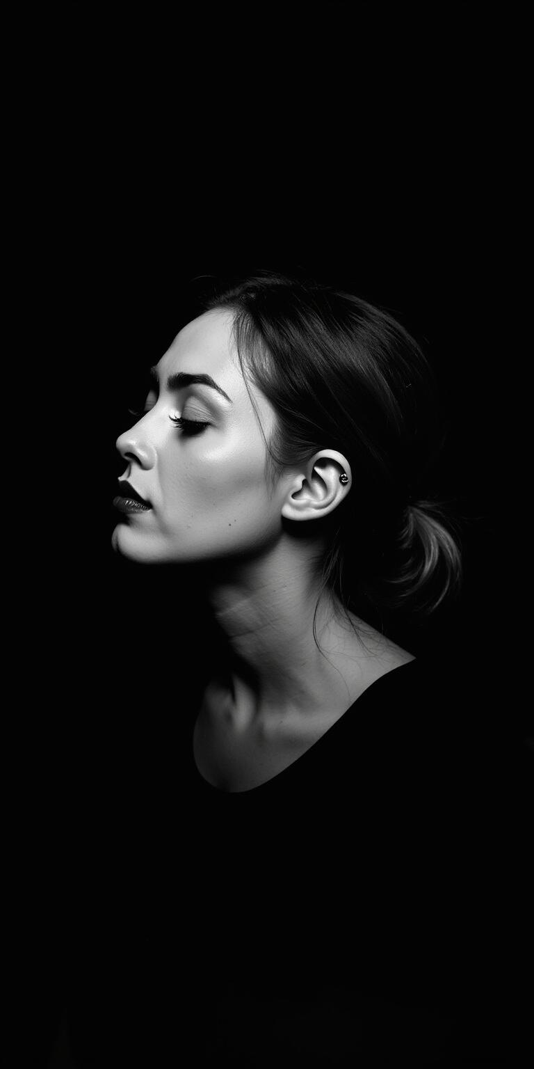 The image is a black and white portrait of a woman's face. The face is in profile, with her eyes closed and her lips slightly parted. The background is completely black, making the face the focal point of the image. The woman's hair is pulled back in a sleek bun, and her expression is peaceful and serene. The image is taken from a low angle, with the focus on her face and the background. The lighting is soft and dramatic, creating a sense of depth and dimension. The overall mood of the portrait is somber and contemplative.