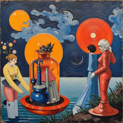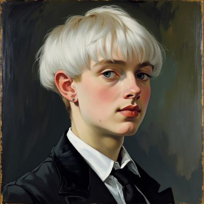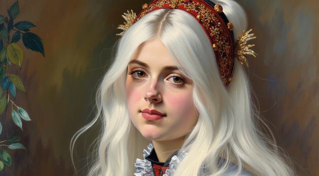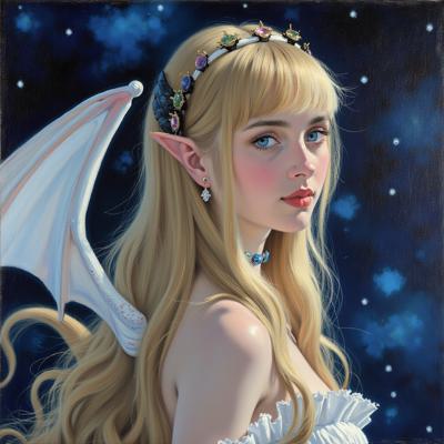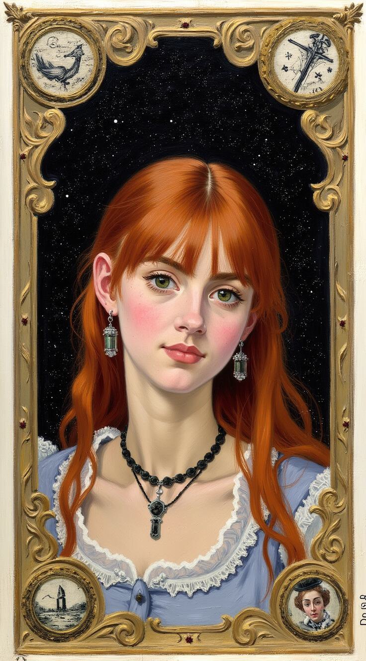 Портрет в рамке молодой ведьмы с зелеными глазами и рыжими волосами. По углам внизу знак воды и знак земли (творческие решения). По углам вверху шкатулки закрытые с рисунками знаков огня и воздуха. На шее в виде украшений два ключа от этих шкатулок. Портрет на фоне созвездий чёрных на белом фоне карты с разметкой. На ведьме длинные золотые серьги и длинное чёрное платье. В длинных волосах золотая заколка. Портрет в полный рост.