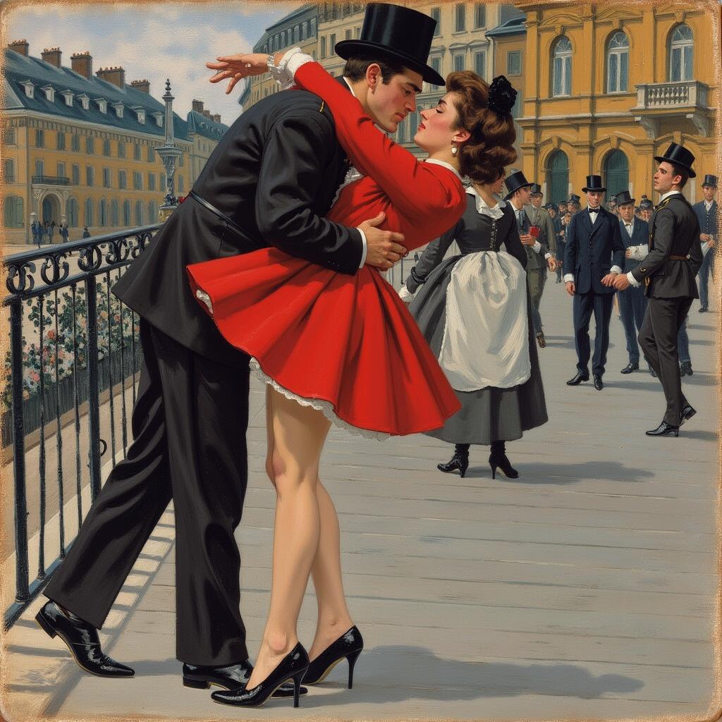 МУЖЧИНА И ЖЕНЩИНА ОДЕТАЯ В КРАСНЫЙ ЖАКЕТИК И МИНИ ЮБКУ В ЧЕРНЫХ НА ШПИЛЬКАХ ТУФЛЯХ ОДЕТЫЕ В СТИЛЕ ВЫСОКОЙ МОДЫ 1950 ГОДОВ АРИСТОКРАТИЧЕСКОЙ ВНЕШНОСТИ . МУЖЧИНА В ШЛЯПЕ И В КОСТЮМЕ . СЦЕНА РОМАНТИЧЕСКОЙ ВСТРЕЧИ ЖЕНЩИНА ВИСИТ НА ШЕЕ МУЖЧИНЫ В ПОЦЕЛУЕ . ОБИ НОГИ СОГНУТЫ НАЗАД В КОЛЕНКАХ . НА ВТОРОМ ПЛАНЕ ФРАГМЕНТ УЛИЧНОГО ФОНАРЯ , ВИТРИНЫ КАФЕ