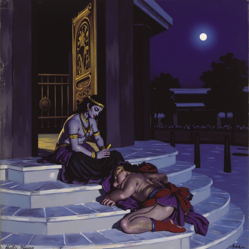 богиня, темные густые волосы, тонкая талия, широкие бедра, пышные формы, тонкая золотая цепочка украшает голову и тело, подвески кристаллы, большая купель-бассейн, отдыхает в воде, вода кристально прозрачная, искрится на солнце, столик с блюдом из керамики заполненной фруктами, фон цветущий сад, античная архитектура, мраморные колонны, пол выложен из разноцветной мозаики, легкий ветер