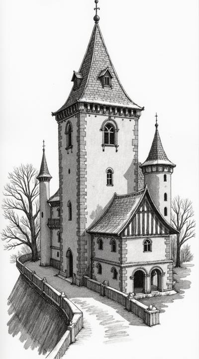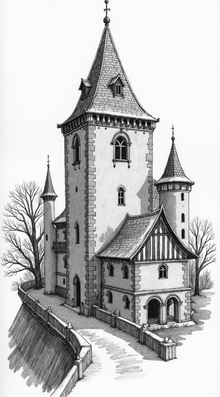 средневековый дворец в средневековом городе. дворец поражает своей , , высотой и стройностью. он как будто воздушный, тончайшие башни и резьба,, , красивейшие арки, , , вокруг дворца видно немного город, дома ниже чем дворец., , , на изображении красивейшая, спокойная, умиротворяющая зима. в башенке , , дворца свет и видно два силуэта, , , атмосфера покоя и уюта