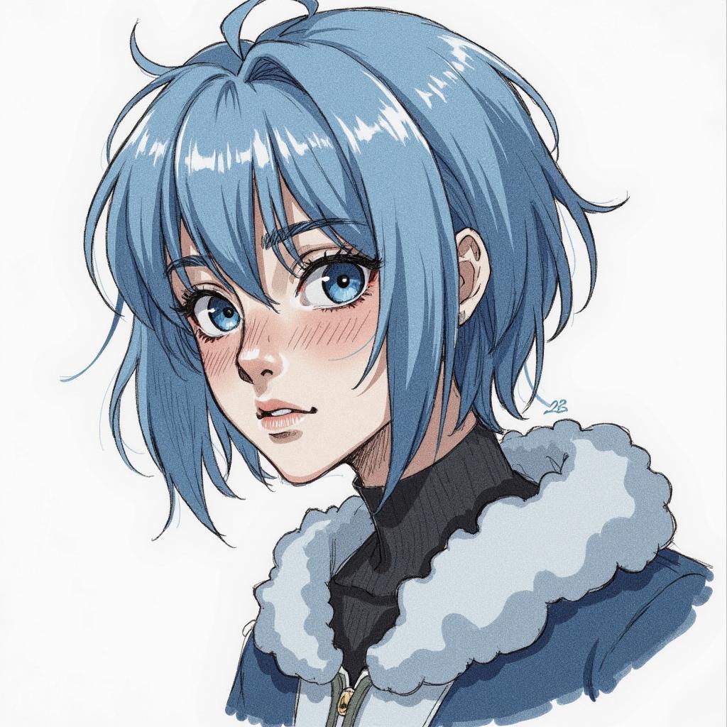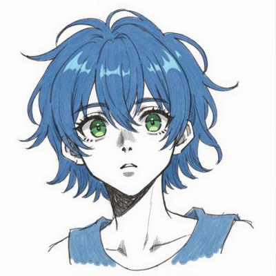 ЭТО НЕ ЖЕНЩИНА, А МУЖЧИНА. Ниндзя из страны Морозного Болота из вселенной "Наруто". 28 лет. Телосложение среднее, атлетическое, но без излишней мускулатуры. Волосы холодно-синего цвета, немного растрёпанные, средней длинны, с несколькими прядями, падающими на лицо. Глаза глубокие, тёмно-синие, с холодным, внимательным взглядом. Высокие скулы, средне-широкое лицо, ямочки на щеках. Короткая катана ниндзя, закреплённая на спине.