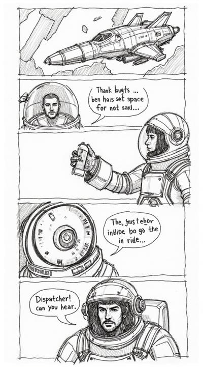 Нарисуй комикс из 5 кадров с высокой детализацией и четким текстом, Сценарий комикса, , Кадр 1:, Детальная панель: сквозь разбитое стекло виден космический корабль., , Кадр 2:, Крупный план: рука в перчатке сжимает значок с надписью «ЗАЕМ»., , Кадр 3:, Астронавт в скафандре (внутри): «Диспетчер! Слышно треск... Системы отказывают!», , Кадр 4:, Статичный кадр Земли. Голос диспетчера: «Корабль «ЗАЕМ». Ваш страховой полис не покрывает ущерб от... метеоритного града»., , Кадр 5:, Астронавт роняет значок. Текст: «Всегда читайте договор до конца».