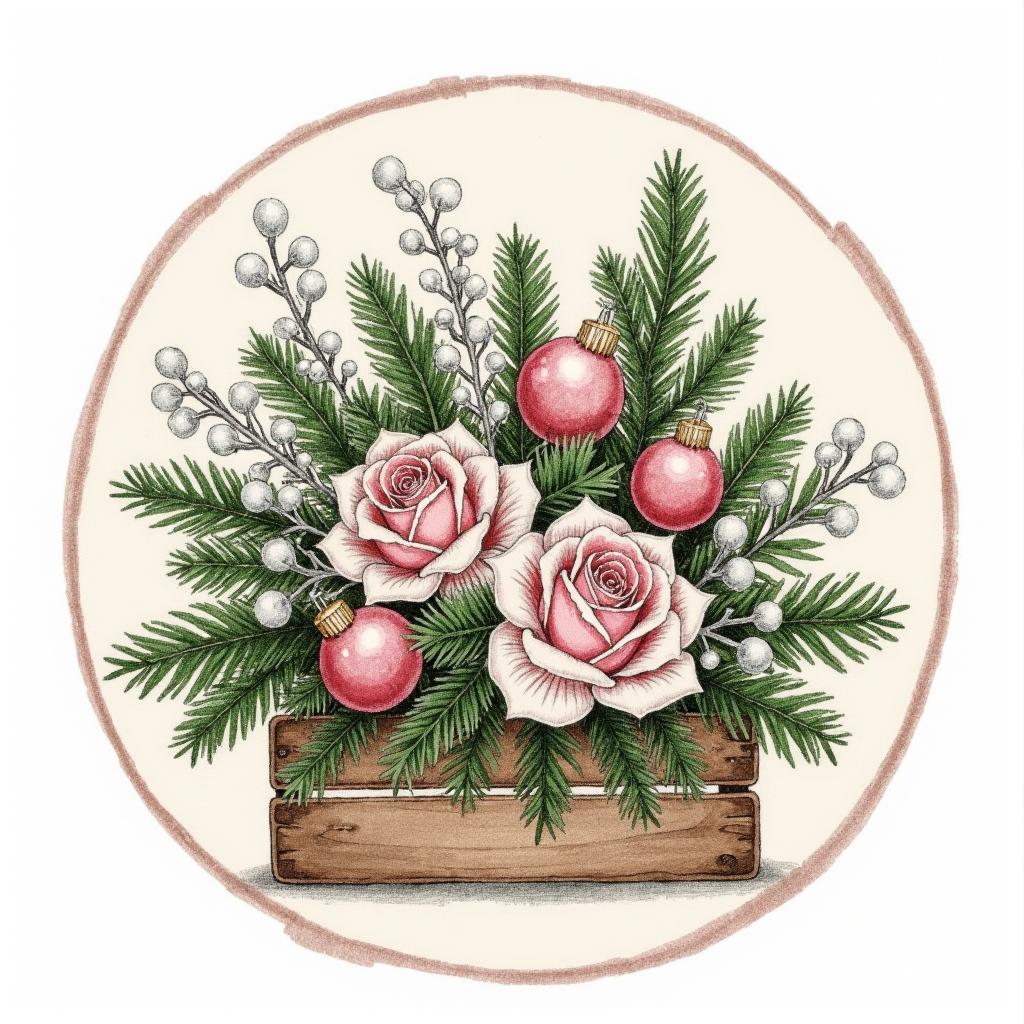 Сделай круглый логотип в аккуратной рамке: рождественская композиция из веточек пихты нобилис, очень насыщенные зеленые пышные ветки, композиция стоит в деревянной прямоугольной корзиночке; композиция украшена декором - розовые елочные шары, белые розочки с серебристым налетом, белые веточки с ягодами, красные маленькие шары; композиция выглядит очень милой и натуральной, создает ощущение уюта и рождественской сказки