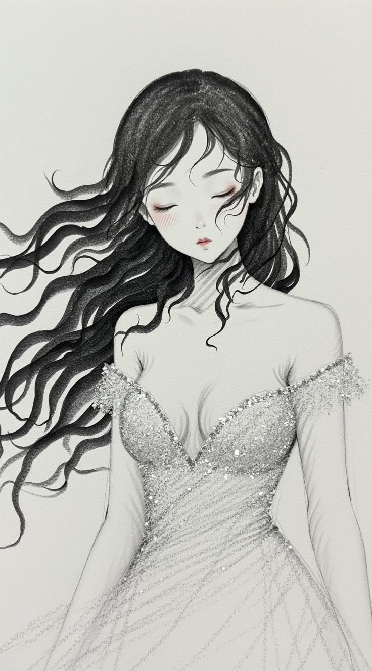 This is a highly detailed, digital CGI portrait of a young woman with fair skin, long dark brown hair, and closed eyes. She is wearing a shimmering, off-the-shoulder, deep V-neck dress made of sparkling silver beads that catch the light. A translucent, beaded veil flows gracefully around her, adding a ethereal quality. Her makeup is subtle, with pink blush on her cheeks and light pink lipstick. The background is a textured, dark green and brown gradient, contrasting with her luminous dress. The image exudes a fantasy-like, dreamy atmosphere, with a focus on elegance and beauty. The overall style is realistic with a touch of fantasy.