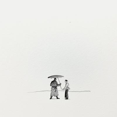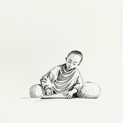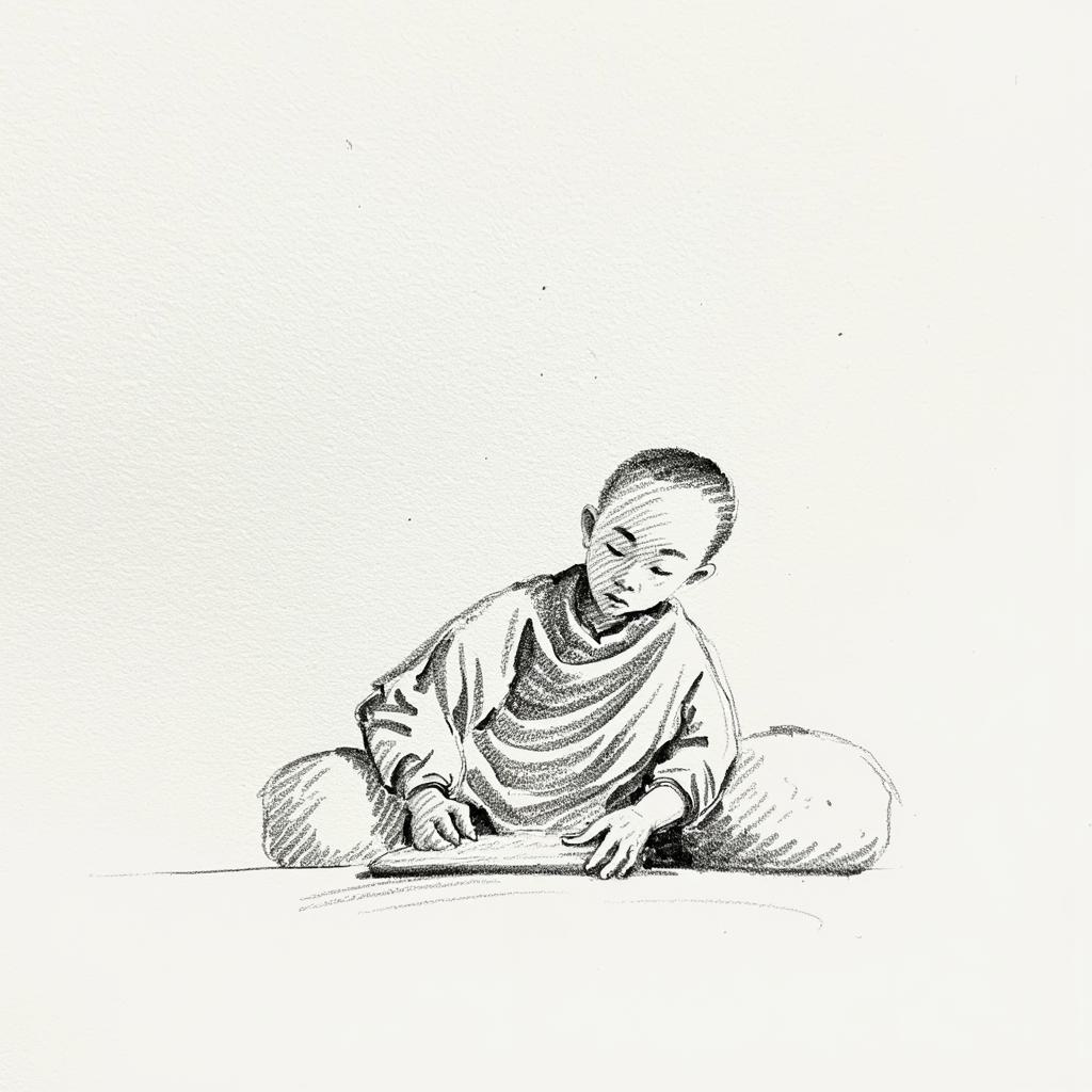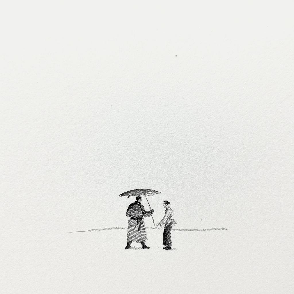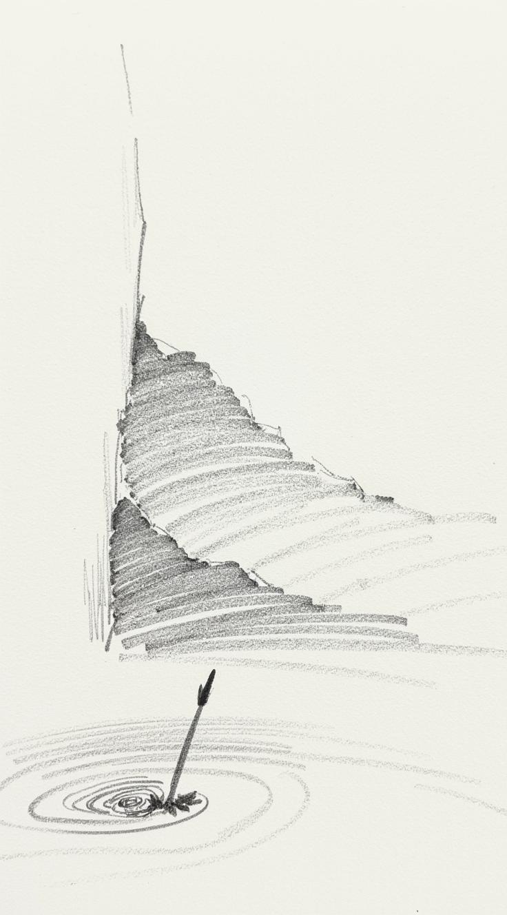 весенний пейзаж в стиле романтической черно-белой гравюры XIX века. Вертикальная композиция с тремя ярусами глубины:, Передний план: немного воды с частой рябью от сильного ветра. Крупным планом — одна стрела, воткнутая в грязь у самой воды., Средний план (контраст): Круто вздымающийся обрывистый берег, поросший лесом. Кроны деревьев резко согнуты одним мощным порывом ветра., Задний план (масштаб): Величественные горные хребты с чёткими вершинами под высоким чистым небом., ощущение весны, надежды, порывистого ветра как обновления, динамичное изображение