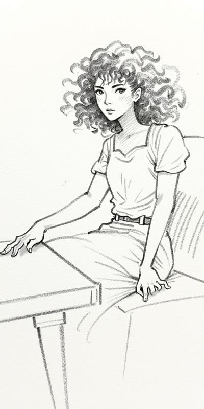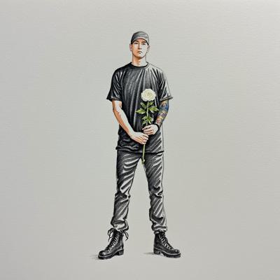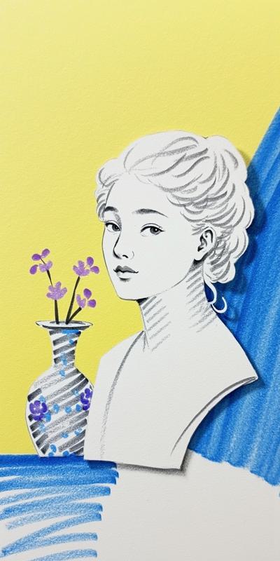 This is a photograph of a painting in a realistic style. It depicts a white marble bust of a young woman with a serene expression, her hair intricately styled. She is seated against a yellow and blue background. To her left, a blue and white vase with purple flowers sits on a blue cloth. To her right, a yellow book with a cracked seashell on top rests on the same blue cloth. The background includes a mix of yellow, blue, and white, creating a vibrant yet serene atmosphere. The textures are smooth with visible brushstrokes, adding depth to the composition.,