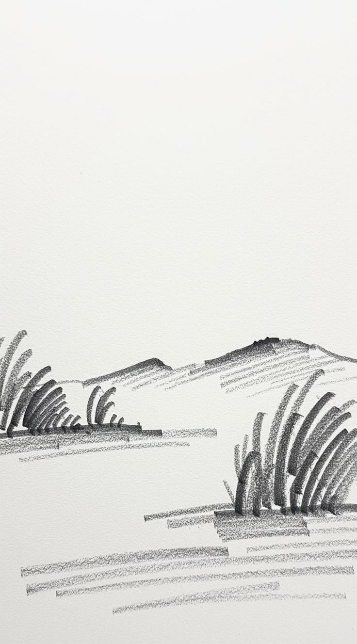 черно-белое изображение. весенний легкий пейзаж. ранняя весна. но без снега, атмосфера надежды. ощущение прохлады, резкости ветра, как бунтарства, на изображении вода, деревья, трава и горы, Фон сжатый, горы близко, без ощущения огромного расстояния., Никакой панорамы, никакого широкого пейзажа., Пространство плотное, сжатое, напряжённое., Весна ощущается физически — холодный ветер, движение, сопротивление., Чёрно-белая графика, резкие мазки, сильное ощущение движения.
