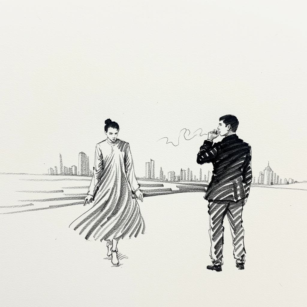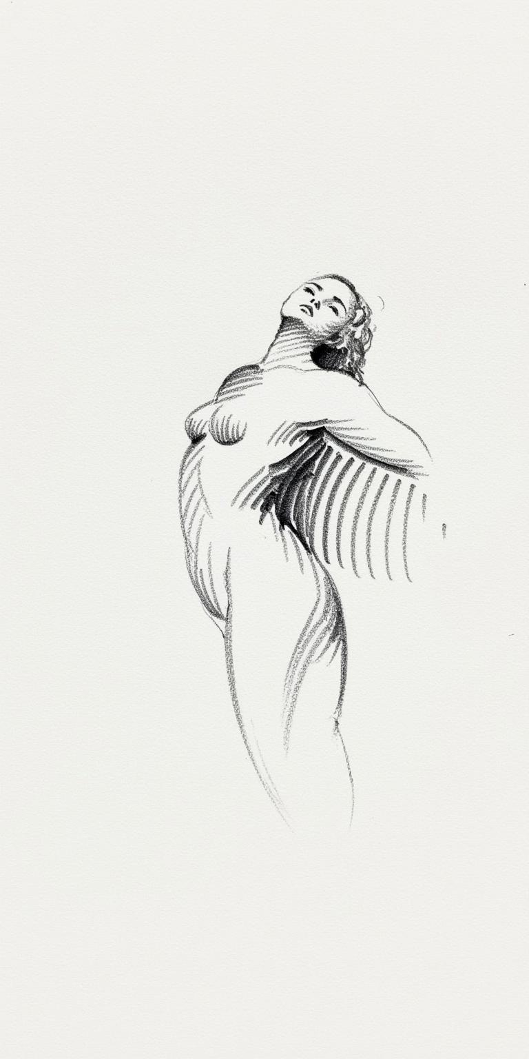 , Черно-белая экспрессивная линейная графика с фрагментированной скульптурой женского бюста, концептуальный рисунок в стиле современного искусства, четкие контурные линии, минимум деталей, без растушевки, без градиентов, без текстурного шума, элегантное негативное пространство, эмоциональная композиция, нарушенная анатомия, выраженная простыми четкими контурами, эстетика плаката для галереи, изысканный минимализм, художественная иллюстрация, чистые черные чернила на белом фоне