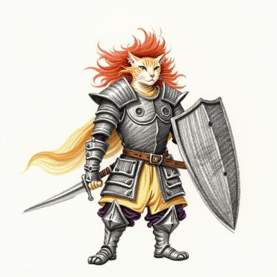 Sir Arthur Redbeard, , Character trait: Brave and noble., , Image: A red-haired cat, a striped hero in practical, slightly worn armor. He's not one to seek adventure, but he's always the first to stand up for the weak. His main weapon is not a sword, but a shield with which he covers his friends. He's a bit old-fashioned and says "sir" and "madam" even to mice.