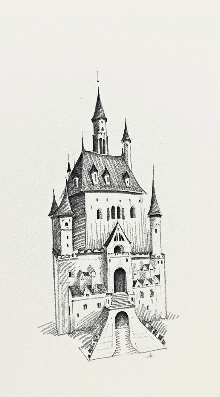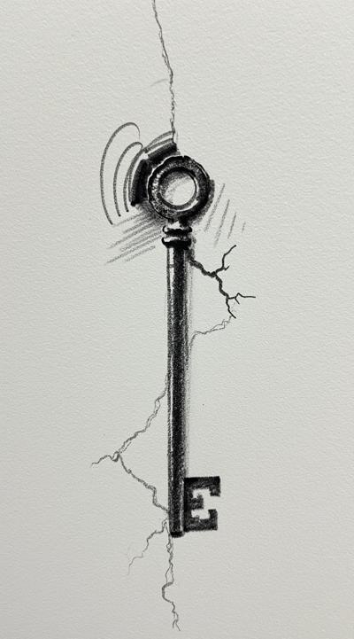 книжная иллюстрация, высокая детализация, черно-белая, стиль Альбрехта Дюрера, викторианская готика, высокая контрастность, старая оштукатуренная стена в полумраке, мощный стальной ключ вбит в штукатурку до половины своей длины, от ключа по стене во все стороны расходятся глубокие трещины в штукатурке, словно от сильного удара, некоторые трещины тянутся до края изображения, штукатурка местами осыпалась, обнажив кирпичную кладку под ней, свет падает сверху слева, подчеркивая рельеф трещин и блеск стали ключа, атмосфера необратимости, разрушения и бесповоротного решения, минимализм, символизм