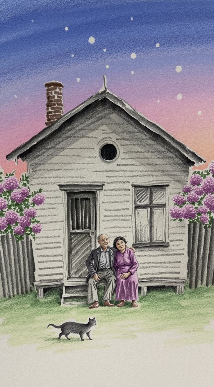Watercolor illustration of a rustic Russian cottage at dusk, an elderly couple sitting on the porch, the man has his arm around the woman, a grey cat at their feet. Lilac bushes in bloom, a wooden fence, fireflies in the air, starry sky above. Soft pastel colors, gentle light, dreamy and nostalgic atmosphere. Style: hand-painted watercolor, artistic, loose brushwork, emotional, heartwarming.