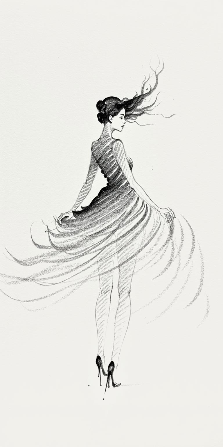 An exquisite kinetic stencil design, an elegant female silhouette in a flowing couture dress and stilettos, a refined pose with light movement, expressive curved parallel lines covering the entire composition, a smooth radial transition from the figure to the edges, architectural folds gently repeating the curves of the body, a dress with barely noticeable movement, an artistic swirl pattern that occupies the entire space, variations of calligraphic lines, luxurious fashion illustration