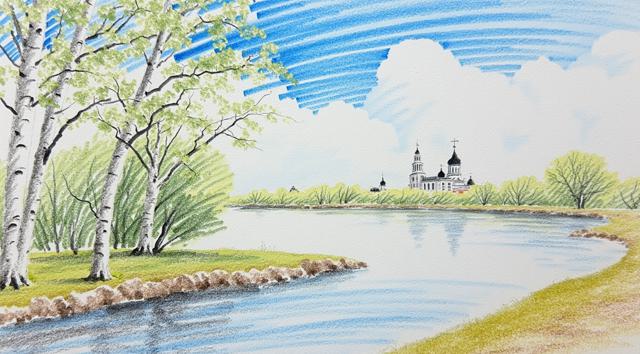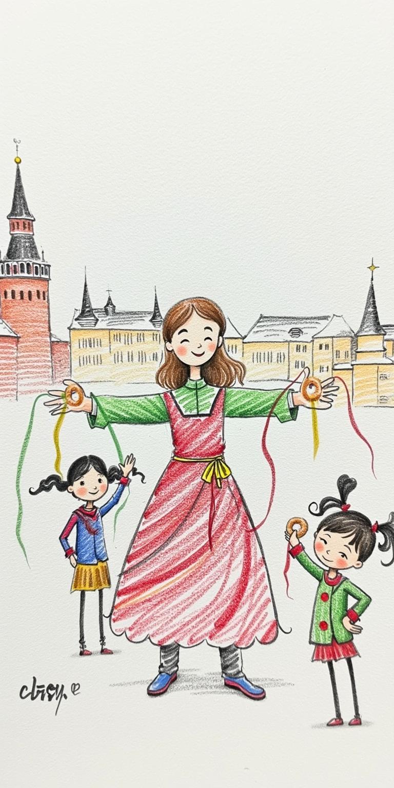 children and adults celebrating against the backdrop of an urban landscape with historical buildings and a snowy landscape. The main object is a spring scarecrow in the form of a Russian woman with bright ribbons and a colorful outfit, symbolizing the end of winter. Children hold bagels and ribbons, joyfully participating in the celebration. Clear lines and bright colors. The bright sky has a festive atmosphere, and the shadows are soft. The dynamic poses of the characters reflect joy and fun.