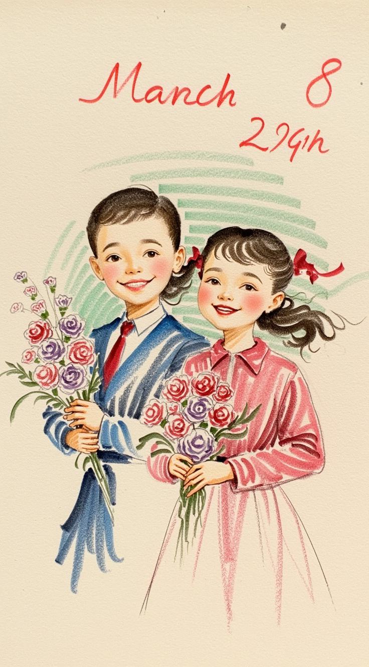 живописная иллюстрация», «гуашь», «бумажная фактура», «эффект офсетной печати». Советская открытка к 8 марта в стиле Зарубина, улыбающиеся дети 1950–1970-х годов, держат букеты цветов, яркие насыщенные цвета, мягкий свет, простой декоративный фон, ностальгическая праздничная атмосфера, стиль почтовых открыток СССР, ретро-иллюстрация"