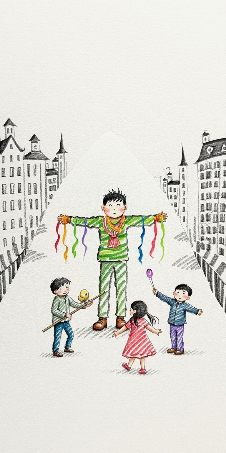 children and adults celebrating against the backdrop of an urban landscape with historical buildings and a snowy landscape. The main object is a spring scarecrow with bright ribbons and a colorful outfit, symbolizing the end of winter. Children hold musical instruments and ornaments in their hands, joyfully participating in the celebration. Clear lines and bright colors create an elegant and lively image style. The bright sky highlights the festive atmosphere, and soft shadows add depth to the composition. The dynamic poses of the characters reflect joy and fun.