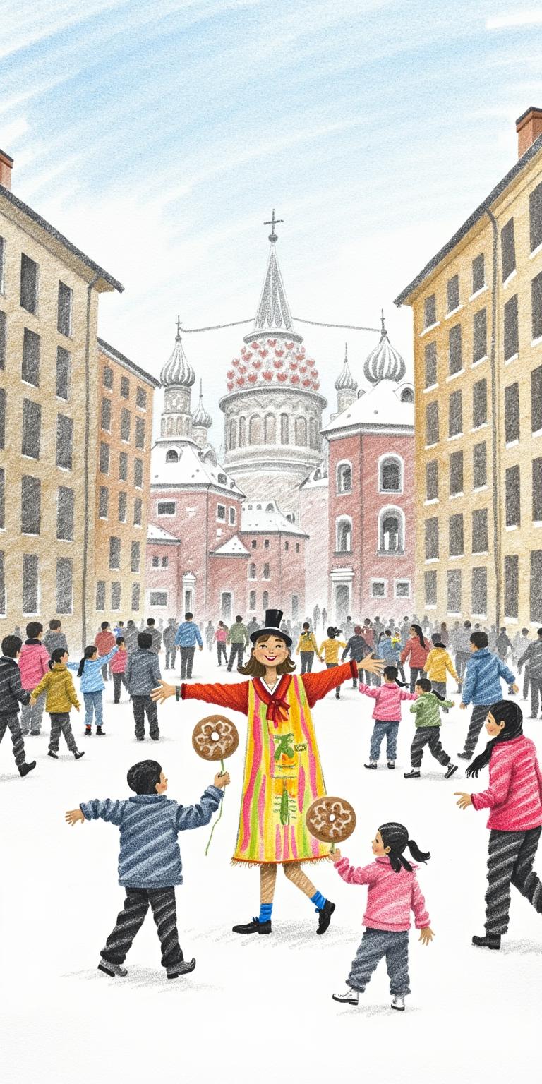 children and adults celebrating against the backdrop of an urban landscape with historical buildings and a snowy landscape. The main object is a spring scarecrow-woman with bright ribbons and a colorful outfit, symbolizing the end of winter. Children hold bagels and ribbons, joyfully participating in the celebration. Clear lines and bright colors. The bright sky has a festive atmosphere, and the shadows are soft. The dynamic poses of the characters reflect joy and fun.