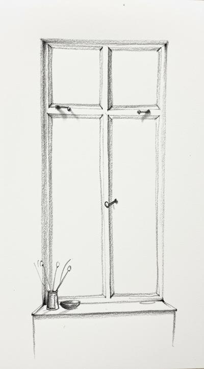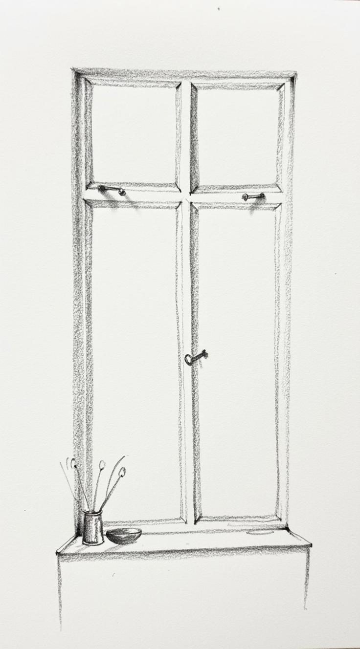 Вид изнутри комнаты., Композиция и ракурс:, Крупный план на подоконнике. Высокое окно занимает весь задний план, но оно сильно расфокусировано. Мы смотрим на него со стороны комнаты, и кадр построен так, что подоконник с предметами находится вплотную к "зрителю", занимая нижнюю половину изображения., , Окно — это световой фон. За ним виден лишь смутный, мягкий силуэт заснеженных крыш города и неба, без деталей., На широком деревянном подоконнике лежат:, , Две фарфоровые чашки, Раскрытая книга лежит рядом.