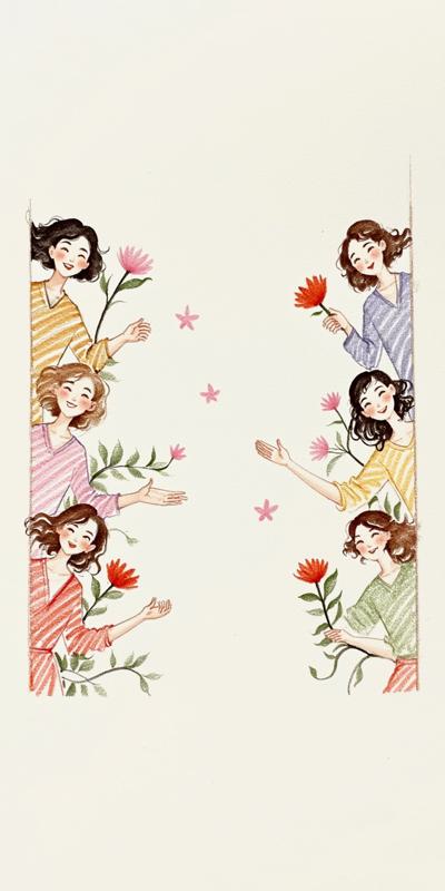 Festive composition for March 8: lush floral background in spring hues (pastel pink, green and white). White-skinned women of different ages cautiously peek out from both sides of the frame, their faces lit up with warm, sincere smiles. Some are waving their hands in greeting, others are holding bouquets of seasonal flowers (tulips, mimosas, hyacinths). The atmosphere is joyful and festive, expressing appreciation and recognition ("Well done!"). Soft diffused lighting creates a gentle glow. Style: Illustration, High detail, 4K