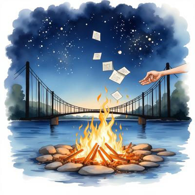 Изобрази минималистичную поэтичную сцену прощания. На переднем плане — рука, бросающая в костёр стопку писем; от них поднимаются тонкие струйки дыма, превращающиеся в очертания моста, который растворяется в воздухе. На заднем плане — звёздное небо с мерцающими точками, похожими на праздничную мишуру. У края изображения — силуэт идущего вдаль человека с прямой осанкой. Цветовая гамма: приглушённые серо‑синие тона с акцентами тёплого жёлтого (огонь) и серебристого (звёзды). Стиль: акварельная иллюстрация с мягкими переходами цвета. Соотношение сторон 4:3.