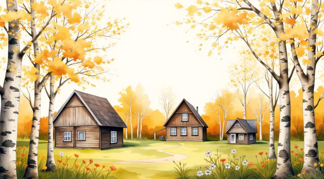 Деревенский пейзаж, праздник масленицы, пастельные тона, теплые оттенки желтого и оранжевого. Яркое весеннее солнце, которое светит сквозь кружевные ветки берез с набухшими почками. На ветках висят разноцветные лоскутки и бублики. Деревянные домики с резными наличниками вдалеке. Стиль иллюстрации "Солнечный дом ДМ", мягкие тени, чистое небо с легкими облаками, много свободного пространства для текста.