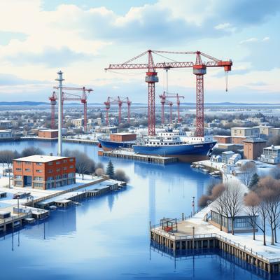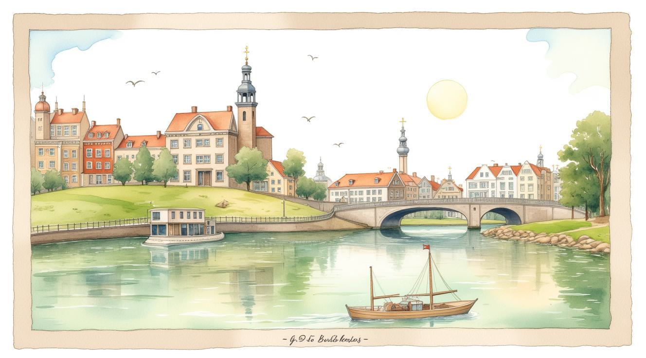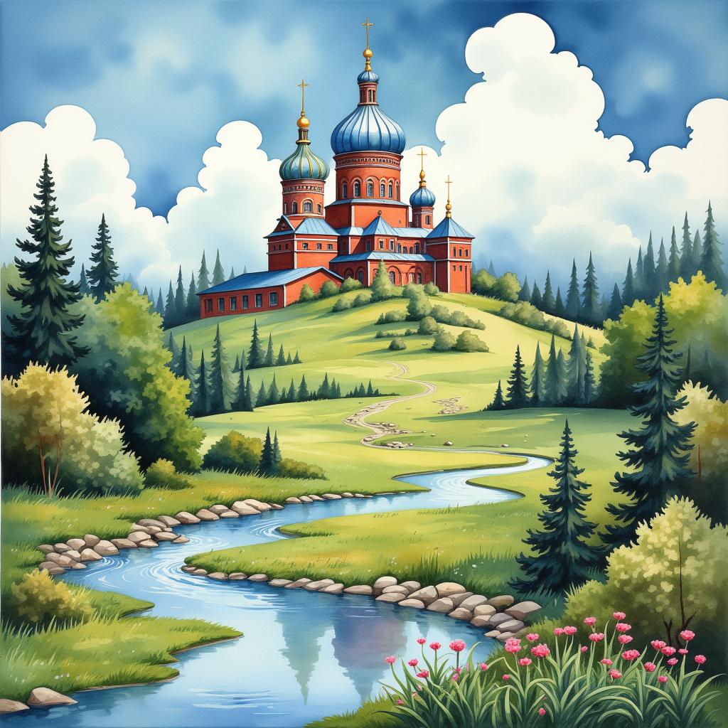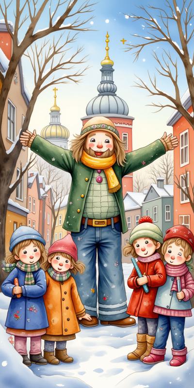 children and adults celebrating against the backdrop of an urban landscape with historical buildings and a snowy landscape. The main object is a spring scarecrow with bright ribbons and a colorful outfit, symbolizing the end of winter. Children hold musical instruments and ornaments in their hands, joyfully participating in the celebration. Clear lines and bright colors create an elegant and lively image style. The bright sky highlights the festive atmosphere, and soft shadows add depth to the composition. The dynamic poses of the characters reflect joy and fun.