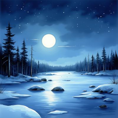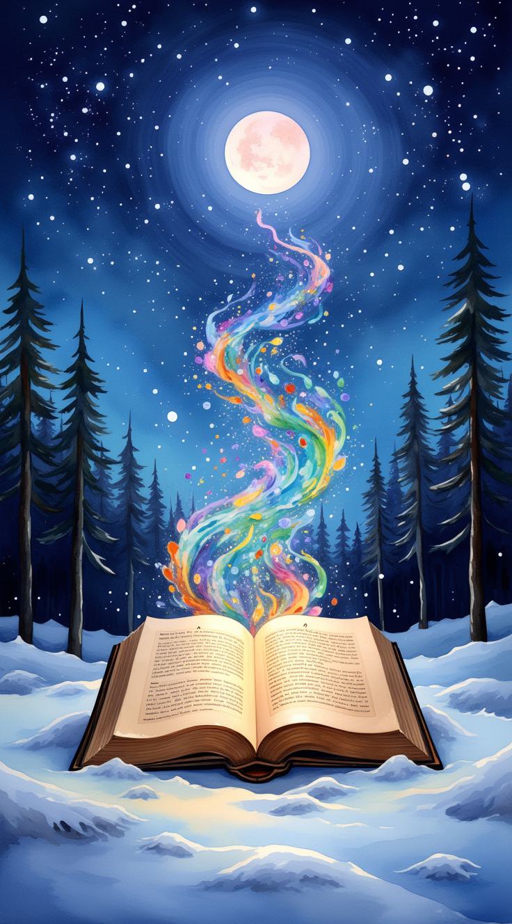 Высококачественная цифровая открытка. Сцена волшебной зимней ночи: раскрытая антикварная книга лежит на свежем снегу на поляне в тёмном лесу, освещённая луной. Со страниц поднимается в звёздное небо кружащаяся разноцветная метель из светящихся слов и музыкальных нот. Большое пятно краски на снегу превращается в цветущие ночные цветы и созвездия. Рядом лежат палитра художника и перьевая ручка как равные инструменты. Цветовая палитра — глубокий полуночный синий и индиго с яркими акцентами золотого и янтарного света, а так же с яркими цветными акцентами. Эфирная, фэнтезийная атмосфера, символическая, высокодетализированная, магический реализм.