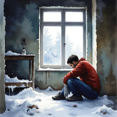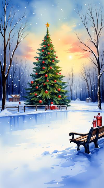 Картина маслом с яркими контрастами и плотной фактурой. Заснеженный каток снег написан густыми белыми и голубыми мазками. В середине катка юольшая наряженная елка, выполненный насыщенной зеленью и алыми акцентами. Мягкий свет заката, переливающийся золотом. На лавочке — яркие термосы и перчатки, всё живое, пастозное, как в тёплой зимней сцене. Атмосфера дружбы и праздника.