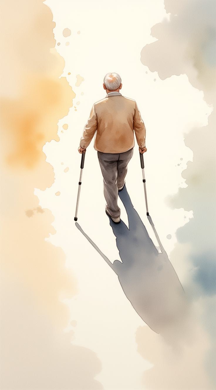 Top-down view, minimalistic composition. A person in the center walking with crutches. Neutral light-colored floor (soft beige or light gray), clean and empty. Around the edges — a few subtle watercolor drops in coffee tones., Warm sunset lighting coming from the northwest direction, long soft shadows., Instead of the person’s natural shadow, a clearly defined shadow of a cyclist riding a bicycle is cast on the floor, aligned with the light source. The shadow should look realistic, elongated, and slightly poetic/symbolic., Soft cinematic lighting, high contrast between warm light and cool floor tones. атмосферное настроение, одиночество, метафора утраченного прошлого.,