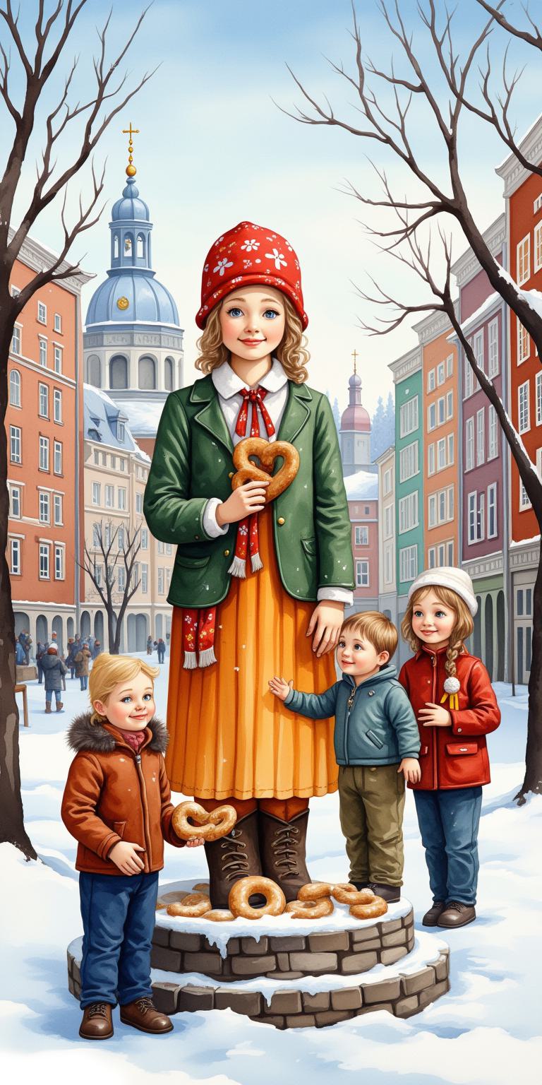 children and adults celebrating against the backdrop of an urban landscape with historical buildings and a snowy landscape. The main object is a spring scarecrow in the form of a Russian woman with bright ribbons and a colorful outfit, symbolizing the end of winter. Children hold bagels and ribbons, joyfully participating in the celebration. Clear lines and bright colors. The bright sky has a festive atmosphere, and the shadows are soft. The dynamic poses of the characters reflect joy and fun.