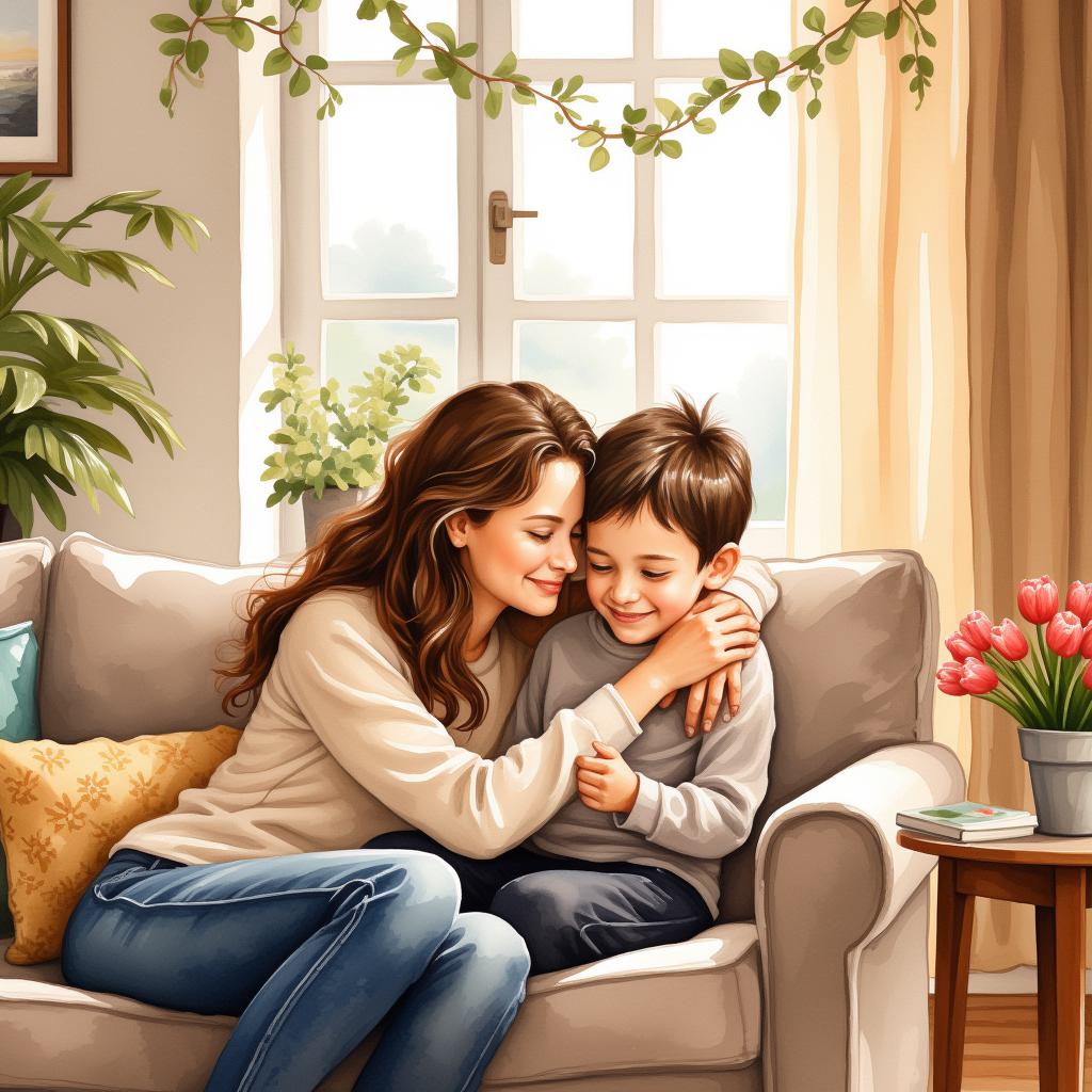День Матери, цифровая живопись, высокая детализация. Мама сидит на диване, а ее сын (6-7 лет) крепко обнимает ее за шею, прижавшись щекой. На их лицах сияют безграничная любовь и счастье. В комнате уютный свет от гирлянды, на столе стоит букет тюльпанов и открытка ручной работы. В воздухе летают легкие, сияющие частички света. Стиль Disney или Ghibli, мягкое освещение, теплые цвета.