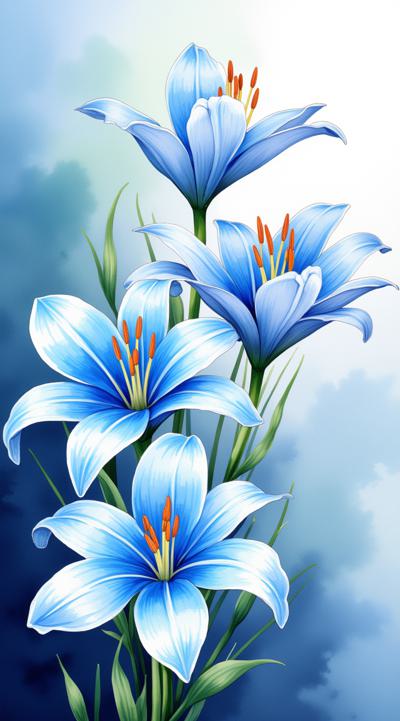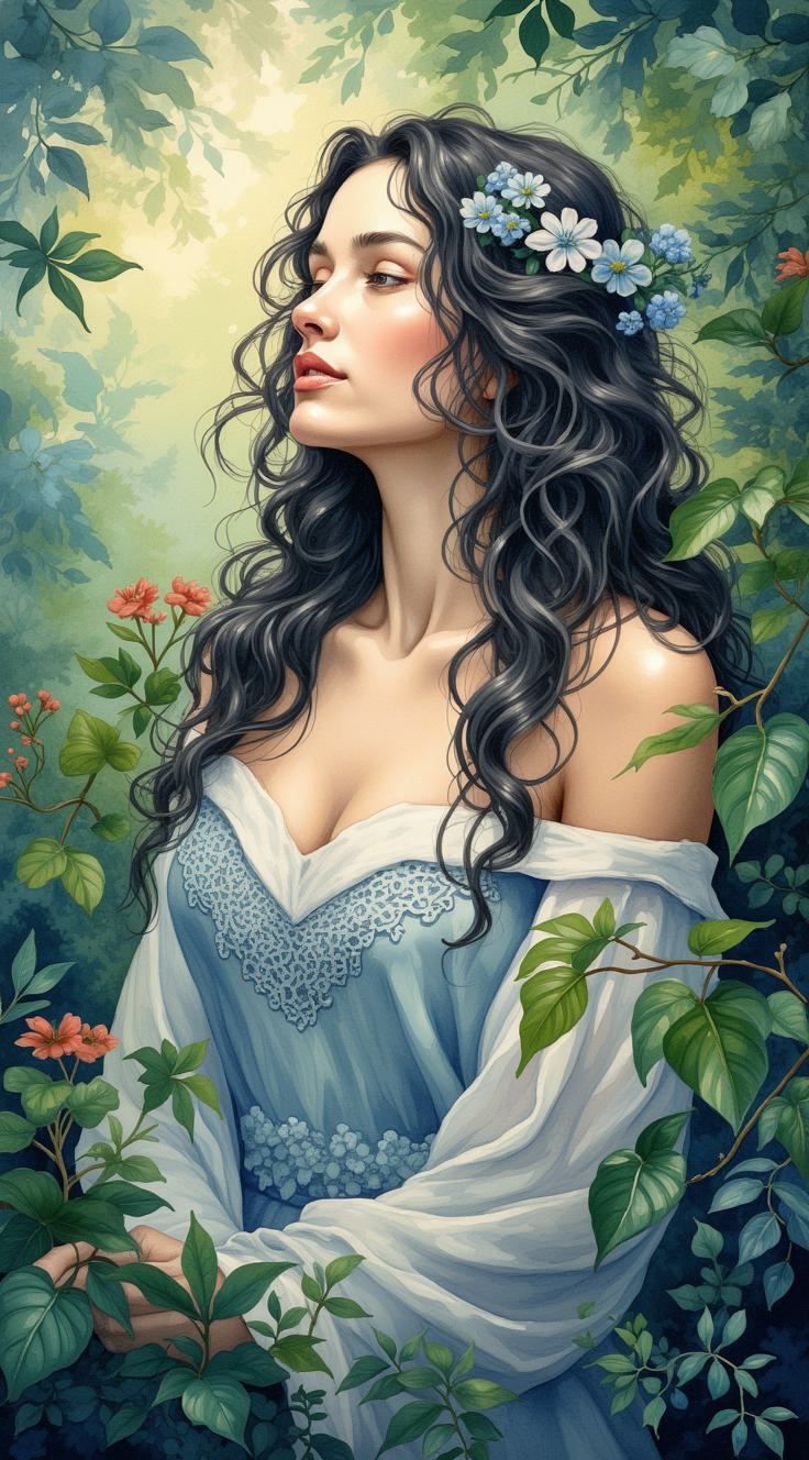 Watercolor acrylic random pose a young Russian woman with short curly platinum hair looks tenderly into the camera, surrounded by layers of light blue tulle fabric that create a dreamy, airy atmosphere. She has smooth and slightly rosy skin, and she uses subtle, natural makeup. The background features a flowing blue fabric that enhances the delicate and artistic composition of the image
