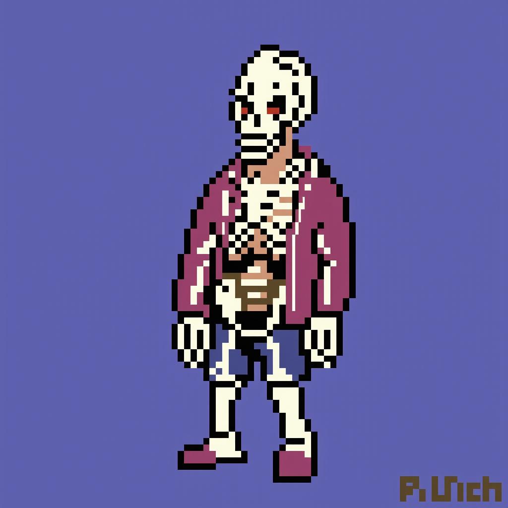 dynamic illustration of Sans the skeleton from UnderTale in a battle pose, floating in the air, one hand in pocket, other hand raised summoning a Gaster Blaster. His left eye is glowing bright blue and yellow. Dark, void-like background with glowing bones. Intense, dramatic lighting, cel-shaded, style of Toby Fox --ar 16:9 --v 6.0