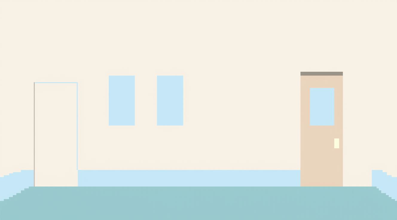minimalist 2D pixel art background,, side view wall of a maternity hospital interior,, flat wall section for 2D platformer,, , white and pale beige hospital wall,, light blue baseboard along the floor,, simple repeating doors in side view,, wall notice boards as flat rectangles,, no depth, no corridor, no vanishing point,, , orthographic flat side view,, wall elevation drawing style,, cutaway side wall, like a platformer level,, , low detail pixel art, solid colors,, no textures, no gradients,, calm sterile mood,, , designed as a scrolling game background,, horizontal repeating composition,, indie narrative pixel art game style,